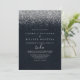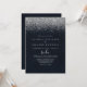 Diese silberne Konfetti-Kalligrafie spanische Hochzeitseinladung ist perfekt für eine rustikale Hochzeit. Das schlichte und elegante Design besticht durch klassische und extravagante Skripttypografie mit blauem Hintergrund und silbernen Konfetti.