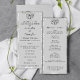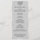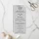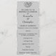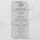 Ein sehr elegantes Hochzeitsprogramm in Grau und Silber, das Teil des korrespondierenden Set der Hochzeitskunst ist, das ein grau-weißes Damastmuster mit silberner Zierverzierung aufweist.