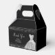 A beautiful silver themed elegant watercolor dress gown on a black background with faux glitter at the top and bottom of the favor box.