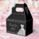 A beautiful silver themed elegant watercolor dress gown on a black background with faux glitter at the top and bottom of the favor box.