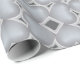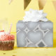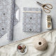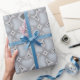 Dieses Packpapier weist ein sich wiederholendes Kachelmuster silberfarbener Herzen auf, das einen zentralen Diamanten umgibt. Große Packpapier für Hochzeiten und Silbergeschenke.