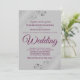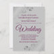 Diese schlichte und dennoch elegante Hochzeitseinladung bietet Magenta oder Cassis lila Schriftzeichen auf grauem Hintergrund. Das Design ist schlicht, aber die Ecken sind mit einer verzierten silbernen Imitat-Folie florale Filigree mit Gürteln und Falten versehen. Der Text ist formell und traditionell, aber das schicke Design macht diese Einladung für jede Hochzeit geeignet.