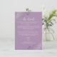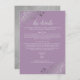 Diese schöne Einschließungskarte dient dazu, Ihren Gästen zusätzliche Informationen über den Empfang, die Unterkünfte, die Reisearrangements, die Registrierung, die Website, die Anfahrtsbeschreibung und alle anderen Einzelheiten zu liefern, die Ihre Gäste benötigen könnten. Das Design ist schlicht und elegant mit weißem Text auf einem Lavendel oder lila Hintergrund, einem zartem Schriftzeichen und fein silberfarbenen Imitaten mit Folienkanten und Wirbel in den Ecken.