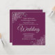 Diese wunderschönen Einladungen für Hochzeiten zeichnen sich durch ein einfaches, raffiniertes, elegantes, traditionelles und modernes Design aus. Der Text ist grau, mit silberfarbenen Filigree-Imitaten oder Blumenschnüren in den Ecken auf einem magenta oder cassis lila Hintergrund. Ideal für eine feierliche oder moderne Zeremonie.