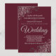 Diese schlichte und elegante Hochzeitseinladung besticht durch eine graue Schriftzeichen auf weinrotem oder bordeauxrotem Hintergrund. Das Design ist schlicht, aber die Ecken sind mit einer verzierten silbernen Imitat-Folie florale Filigree mit Gürteln und Falten versehen. Der Text ist formell und traditionell, aber das schicke Design macht diese Einladung für jede Hochzeit geeignet.