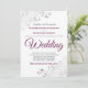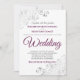 Die Einladung zum Hochzeitsfeiern bietet ein schlichtes und elegantes Design mit lila oder magentafarbenen Schriftzeichen auf weißem Hintergrund. Die Einfachheit des Designs wird durch die silbernen Imitate-Folienschellen in den Ecken ausgeglichen. Das extravagante Filigree ist verziert und blumig und bildet einen schönen Kontrast zum dezenten Text. Die Formulierung ist formell und traditionell, aber die schicke Anordnung macht es modern und zugänglich.