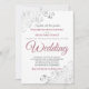 Die Einladung zur Hochzeit ist schlicht und elegant, mit robuster Rose oder violett-grauem Schriftzeichen auf weißem Hintergrund. Die Einfachheit des Designs wird durch die silbernen Imitate-Folienschellen in den Ecken ausgeglichen. Das extravagante Filigree ist verziert und blumig und bildet einen schönen Kontrast zum dezenten Text. Die Formulierung ist formell und traditionell, aber die schicke Anordnung macht es modern und zugänglich.