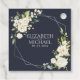 Dieses moderne und trendige Design mit Gastgeschenk Hochzeit-Tags besticht durch ein geometrisches Imitat aus Silberfolie, das mit Eukalyptusgrün in Aquarellen und mit weißen Blumenarrangements auf einem modernen marineblauen Hintergrund geschmückt ist. Copyright Elegant Invites, alle Rechte vorbehalten.