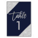 Silver typography on customizable navy blue rose gold glitter color block, and faux silver geometric stripes chic table number wedding , perfect for elegant, beach wedding,