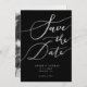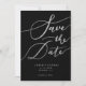 Elegante und einfache Hochzeit speichern Sie die Dattelkarte. Der handgeschriebene Typografietext ist in Imitaten silberner Glitzer auf schwarzem Hintergrund.