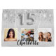 Eine Geschenktasche für eine gmädchenhafte und glamouröse Quinceañera, 15. Geburtstag. Ein silberfarbener Hintergrund mit Staub aus Glitzer. Personalisieren und fügen Sie 3 Fotos und einen Namen hinzu. Nummer 15 wird mit einem Schriftart im Ballonstil geschrieben. Perfekt als Gastgeschenk Tasche oder als Geschenktasche.