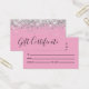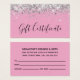 Modernes, gürtelfreundliches Design für Ihre kleinen Geschenkgutscheine in Visitenkartengröße. Alle Texte und Zeilen können individuell angepasst werden, wenn Sie andere Informationen benötigen, während Sie Ihre eigenen kleinen Geschenkkarten erstellen. Wenn Sie mehr als zwei Zeilen für Ihre Kontaktinformationen benötigen, gibt es viel Platz, um die verschiedenen Elemente zu verschieben. Die Imitate funkelnd silberne Glitzer-Grafik in diesem Design Druck wie ein Foto. Sie können die hellrosa Hintergrundfarbe ändern.