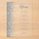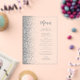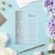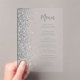 Die links Kulisse dieses eleganten, modernen Hochzeitsmenüs besticht durch ein Imitat mit silberfarbenem Glitzer. Der benutzerdefinierbare Text kombiniert graues Handschriftzeichen und serifenlosen Schriftart auf einem klaren Hintergrund.