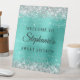 Schaffen Sie sich Ihr eigenes 16. Geburtstagsfest und freuen Sie sich auf ein Willkommensschild für Ihren Freund. Im Hintergrund befindet sich ein funkelnd silberner Imitat mit einem türkisfarbenen, aquamarinen Imitat, der die Digitalkunst mit einem Glitzer umspannt.