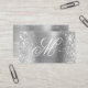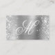 Erstellen Sie Ihre eigenen Imitate funkelnd silber Glitzer und silberne Satin-Folie Visitenkarten. Auf der Vorderseite befindet sich ein extravagantes, weißes Kalligraphieskriptmonogramm. Sie können die Farbe und den Stil des Schriftartes anpassen. Auf der Rückseite sind weitere Kontaktinformationen verfügbar. Ein mädchenhaftes Design für Hochzeitsplaner oder Schönheitstechniker. Alle mädchenhaften Grafiken und Elemente dieses Designs werden wie ein digitales Foto gedruckt.