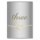 Einfache, minimalistische, moderne Imitate Silberfolie Hochzeit Tischnummer mit handgeschriebenem Kalligraphieskript und Goldseilherz.