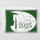 Eine Silhouette eines jungen Mannes in seiner Mütze und in seinem Kleid. Blühende Designs im Hintergrund. Die Rückseite hat einen grünen Hintergrund mit weißen Buchstaben für die Abschlussfeier Einladungen.