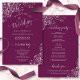 Diese Hochzeitsprogramme sind elegant und geschmackvoll, aber dennoch preisgünstig. Die verzierte silbergraue Imitat-Folie mit hellgrauem Text auf einem lila, magenta- oder berry-farbenen Hintergrund. Die Typografie zeigt eine laky Skriptkalligraphie, und es gibt Raum für Details über die Zeremonie, das Brautparty, und ein kurzes Dankeschön.