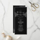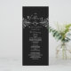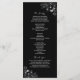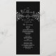 Elegantes, modernes, schwarz-weißes Hochzeitsprogramm mit Silberseilherz und Vintag vergoldeter Blumenspitze.