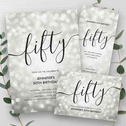 Elegante Glam Silver Glitzer Lights 50. Geburtstagsskripte mit Party- und Menütext, Glitzer-Leuchten und modernem Typografie-Script.