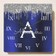 Silver Navy Blue Glitzer Brushed Metal Monogram Quadratische Wanduhr