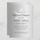 Ein schlichtes, aber elegantes Design mit einem weißen Schneeflocken auf silberfarbenem Hintergrund, mit den Worten "Probe Dinner" und den Namen von Braut und Bräutigam in kohlegrauer Schrift, und dem restlichen Text in Sans Serif Schriftart. Das Schneeflockendesign wird auf der Rückseite wiederholt.