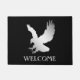 Eine silbergraue Adlernadel-Silhouette ist unten rechts von dieser Türmatte. Der Adler steht kurz davor, über seine Beute zu sinken, seine Krallen überdehnt und die Flügel hochgehoben zu werden. Der silberne Text am unteren Rand sagt zur Zeit WELCOME, aber Sie können ihn einfach an Ihren Namen anpassen, wenn Sie es vorziehen. Das Bild und der Text werden auf einem schwarzen Hintergrund platziert.