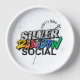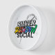 this is a clock with the silver rainbow social group logo on it
