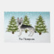 Desteis originelle Cartoon Illustration eines silberfarbenen, schwarz und silberfarbenen deutschen Schäferhundes. Der Hund ist in einer Winterlandschaft mit drei grünen Tannenbäumen und fallendem Schnee untergebracht. Der Hintergrund ist ein blaues bis weißes Gefälle, das das Design des kalten Wintertages verleiht. Es gibt auch einen personalisierbaren Textbereich für einen Namen.