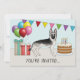 Desteis originelle Cartoon Illustration eines silberfarbenen, schwarz und silberfarbenen deutschen Schäferhundes. Der Hund ist in einer bunten Geburtstagslandschaft untergebracht. Es gibt einen Geburtstagskuchen mit ein paar Kerzen darauf, bunte Geburtstagsballons und ein buntes Banner sowie zwei Geschenkschachteln. Personalisieren Sie die Textbereiche mit den Details Ihres Events.