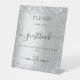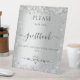 Imitat silber aussehender Hintergrund, mit Imitaten verziert silberne Konfetti. Mit dem Text: Bitte unterschreiben Sie unser Gästebuch. Ein Tafelschild, auf dem die Gäste zur Unterschrift gefragt werden, und Ihr Gästebuch.