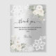 Ein Imitat silber aussehender Hintergrund. Weiße Rosen, Blume und weiße Spitzen. Große handgeschriebene Skripte mit Swashes und den Text: Danke. Personalisieren und hinzufügen Dankeschön Note und Name.