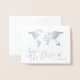 Eine echte Silber-Weltkarte auf der Vorderseite einer gefalteten Save the Date-Karte für eine Hochzeit im Ausland, Hochzeit in Urlaubsort oder Reise-Thema Empfang, mit 2 Fotos und Reisedetails und Website innen auf einem gedämpften staubigen Rose rosa bearbeitbaren Farbhintergrund.
