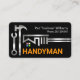 Ein ganz schwarzes Cover ist mit einer silbernen Silhouette aus Gebäude auf dem Dach, die aus einem silbernen Schlüssel mit einem Hammer und einem Spanner daneben besteht. In der oberen Ecke befindet sich Ihr angesehener Name und Telefonkontakt mit dem überdimensionalen gelben Firmennamen "HANDYMAN" (den Sie ändern können) in der Nähe der Basis. Oben ist ein silbernes Logo "Zuhause handyman tools", das Sie verwenden können. Danach folgen Ihr Name, die Kontaktdaten und ein Slogan, um Ihre Dienste bekannt zu machen. Buchstaben hier sind in Imitat Silber. Ein großartiges Design für Dachdecker, Handwerker, Zuhause-Reparatur und Bauwesen.