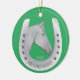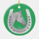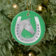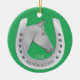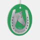 Ein Ornament mit einem klassischen Pferd- und Hufeisenemblem mit einem Maßansatz, der mit Ihrem Familiennamen personalisiert ist, oder Sie können einen Vornamen oder den Namen Ihres Pferdes verwenden. Ein Pferdeakzent für Ihre Feierlichkeiten. Ein tolles Geschenk für Pferdefreunde, Pferdebesitzer und Pferderennfans. Die Farbe der Pferdeschuhe wird in silbergrauen Farben wiedergegeben. Klassisch, elegant. Schöner und lustiger Reitstil. Dieselbe Abbildung vorne und hinten. Grüner Hintergrund oder fügen Sie Ihre Lieblingsfarbe im Design-Tool hinzu.