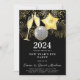 Ein modernes Neujahr 2024 mit Champagnergläsern, Ballons und Glitzer mit Feuerwerk auf schwarzem Hintergrund. Platinum Imitat Gold-Folie auf der Rückseite der Einladung.