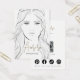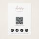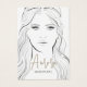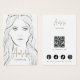This jewellery display card features a minimalist drawing of a girl with long hair, designed in black and white for a clean, elegant look. It includes spots to showcase earrings on her ears. The card is customizable with your name, website, slogan, and social media icons, plus a QR code for easy digital access.