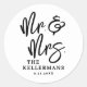 These custom round stickers feature a clean, all-white background with “Mr. & Mrs” in large black handwritten script at the center. Directly below, the couple’s last name and wedding date appear in classic black serif fonts, creating a timeless and balanced look.