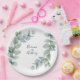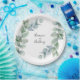 Dieses moderne, frische Design verbindet sich mit vielen beliebten Hochzeitsfarben und zeichnet sich durch seine Sprigs von Aquarelleukalyptuszweigen aus, die Ihren Text abrahmen. Personalisieren Sie die Namen der Braut und des Bräutigams oder anderen gewünschten Text. Feiern Sie das glückliche Paar bei einem Polterabend, einer Verlobungsfeier, einem Hochzeitsempfang oder einem anderen Event mit diesen maßgeschneiderten Tellern. Erhältlich in 2 Größen: 9-Zoll Durchmesser oder 7-Zoll Durchmesser.