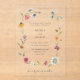 Diese schlichte und helle Hochzeitseinladung besticht durch einen farbenfrohen Kranz mit einer Mischung aus rosa, blauen, orangefarbenen, lila und grünen Blume und Blätter. Die Illustration rahmt Ihren schwarzen, klassischen Text mit Akzenten moderner rustikaler Schrift, alles auf einem klaren Acrylhintergrund.