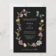Diese schlichte und helle Hochzeitseinladung besticht durch einen farbenfrohen Kranz mit einer Mischung aus rosa, blauen, orangefarbenen, lila und grünen Blume und Blätter. Die Illustration rahmt Ihren weißen, klassischen Text mit Akzenten moderner rustikaler Schrift ein, alles auf dunklem schwarzem Hintergrund.