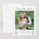 Eine elegante grüne Kalligraphie-Skript mit zwei Aquarell Eukalyptus-Blätter auf beiden Seiten unten, um dieses wunderschöne neu vermählte Foto zu schmücken danke Postcard für eine Hochzeit im Herbst. Eine schöne, moderne Hochzeitspostkarte des Dankes für einen Gartenabend-Anlass mit Ihrem Pärchen-Foto unter der schlichten, schicken Typografie.