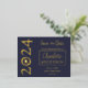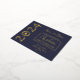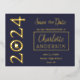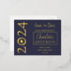 Einfach, elegant und modern Single "2024" grad cap Abschluss Ankündigung Postcard Design. Enthält die Details Ihres Abschlusses auf der Vorderseite rechts mit dem Jahr in Goldfolie Text Kunst auf verlassen (Message Designer, wenn Sie dies ändern müssen). Auch der Vorname des Absolventen in einem Schriftart mit dem Nachnamen in einem Serifenstil-Schriftart, alle in einem goldenen Folienpanel mit einer goldenen Folienkante über einem blauen Hintergrund, um den Namen Ihres Absolventen zu markieren. Geben Sie die Schule und das Datum auch vor. Vorderer Text ist in Goldfolie. Der hintere Text ist blau. Der Rücken gibt einen Überblick über die Ankündigung und liefert weitere Details. Eine einfache und elegante Art, Empfänger "Save the Date" zu fragen. Design by Holiday Hearts Designs (Rechte vorbehalten).