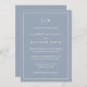 Einfache, staubblaue Hochzeitseinladung mit modernem und elegantem Design, oben mit zwei Buchstaben-Monogramm und in einem dünnen Rahmen. Die Schriftart und Hintergrundfarben können durch Anklicken des Buttons "Anpassen" in beliebig viele Farben geändert werden. Ein elegantes und stilvolles Design, das sich ideal für ein minimalistisches Paar eignet.