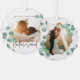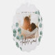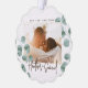 Create your own wedding keepsake with this Elegant Greenery Merry and Married Photo Holiday ornament card. This modern and chic design features eucalyptus branches watercolor illustrations and a stylish faux gold foil geometric photo frame. Add two custom photo on front and back, newlywed names and a personalized text. Show all your love with this one ok a kind custom ceramic ornament. perfect also as anniversary and engagement gift. No minimum order.