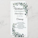 Celebrate your special day with this elegant eucalyptus wedding program. Featuring a simple and timeless design with soft green eucalyptus accents, it beautifully complements your wedding stationery suite. Perfectly organized to guide your guests through the ceremony, this program combines style and function for a memorable keepsake. Customizable text allows you to include your wedding details, order of service, and special notes.
