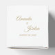 Diese einfache Goldkalligraphie-Quadrat-Gefälligkeitsbox bringt einen eleganten Luxus, aber gleichzeitig ein modernes Gefühl zu einer minimalistischen und traditionelleren oder formellen Hochzeit. Die lässige Kalligraphie ermöglicht ein antikes Ambiente, während das klassische neutrale Design mit jedem einzigartigen Aspekt Ihrer Ehefeier kombiniert werden kann.