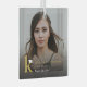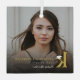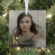This classic and simple gold and white graduation photo ornament design features a bold monogram letter 'K' of the graduate with a white mortarboard / graduation cap as an accent on a black gradient photo overly.