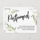 Auf der Vorderseite befindet sich ein grafischer Header, den ich mit einem modernen, lässigen Schriftart entworfen habe, der "Zurückgestellt" heißt. Weiter unten gibt es eine fröhliche Nachricht, die Sie bearbeiten können, die Ihre Nachricht verkündet: "Wir werden immer noch heiraten! Im Moment sind wir uns einfach nicht sicher, wann es passieren wird." Durch die Aquarellflächen aus Blattwerk wurden alle Schichten getrennt hinzugefügt und links, um Ihnen eine maximale Kontrolle zu geben. Drehen und verändern Sie alle Teile, die Sie bearbeiten möchten. Benutzen Sie die Vorlagenfelder, um Ihre persönlichen Daten hinzuzufügen und einen beliebigen Textentwurf zu ändern, um Ihre Bedürfnisse und Situation Anzug. 105 //
