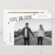 Modern and stylish save the date card featuring a modern typography text that says "save the date." One photo in the font and one on the back. The background is white.